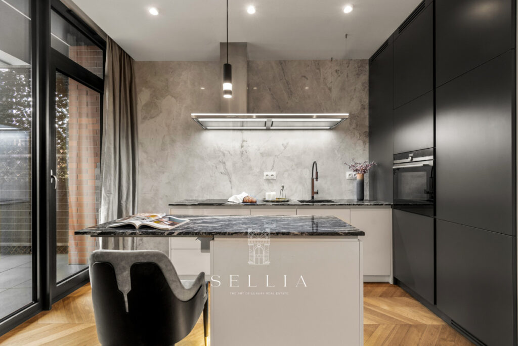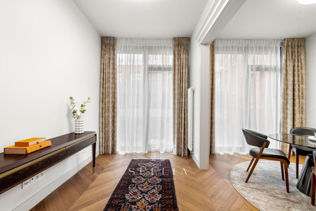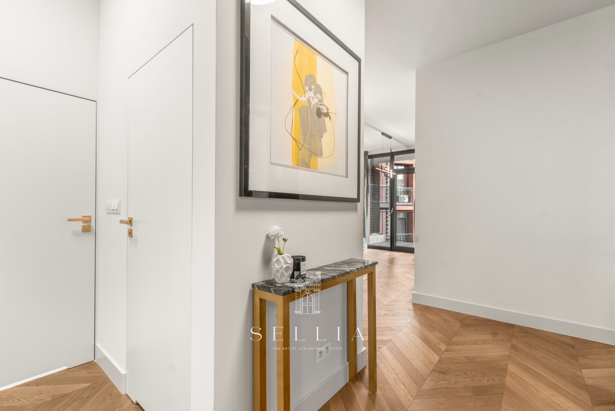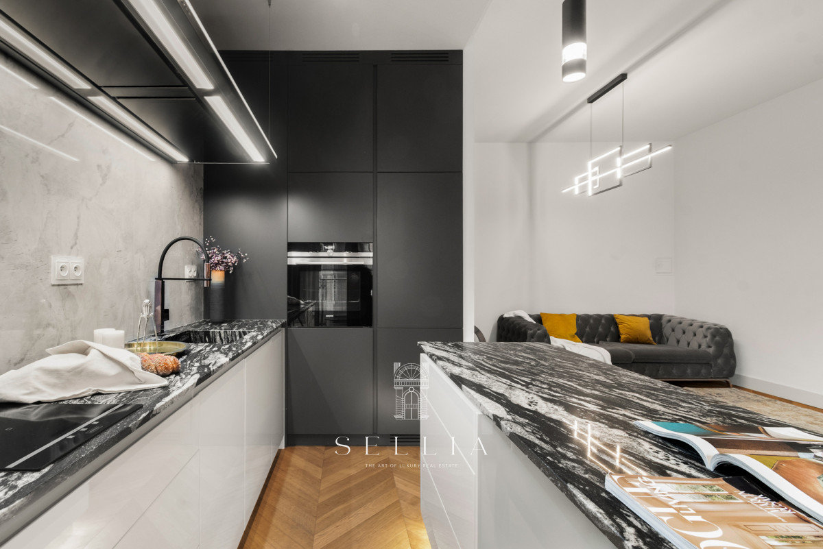 The apartment has been finished to a high standard, using top-quality materials and with great attention to detail. Natural oak flooring adds warmth and elegance to the interiors. The bathroom is finished in marble, while the kitchen features granite and decorative quartz countertops. A cohesive design, modern lighting, and a well-thought-out layout create a harmonious and functional living space. The apartment is partially furnished and ready to move in.