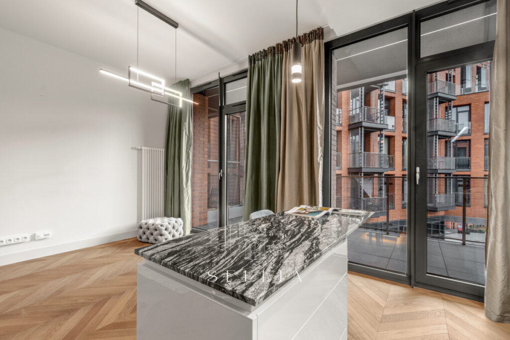 Apartament został wykończony w wysokim standardzie, z wykorzystaniem materiałów najwyższej jakości oraz dbałością o detale. Na podłogach zastosowano naturalny dąb, który nadaje wnętrzu elegancji i ciepła. Łazienka wykończona została marmurem, natomiast kuchnia wyposażona jest w granitowe oraz dekoracyjne blaty z kwarcu. Spójna aranżacja, nowoczesne oświetlenie oraz przemyślany układ pomieszczeń tworzą harmonijną i funkcjonalną przestrzeń. Apartament jest częściowo umeblowany i gotowy do wprowadzenia.