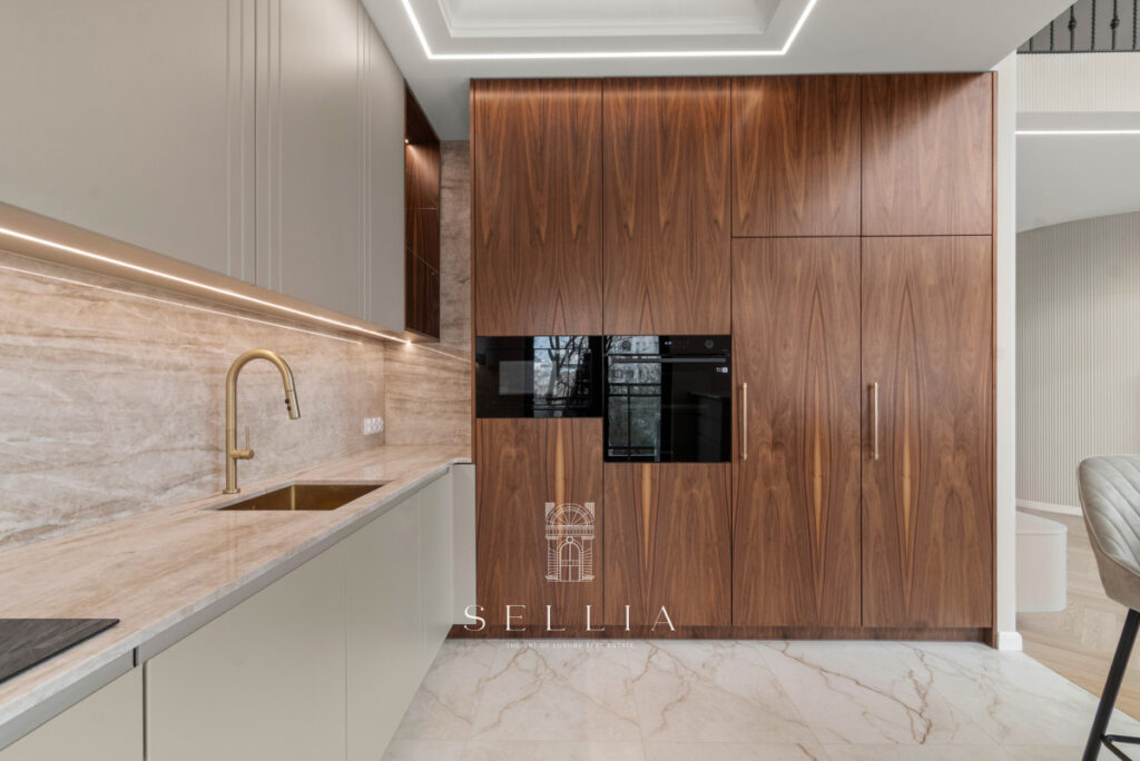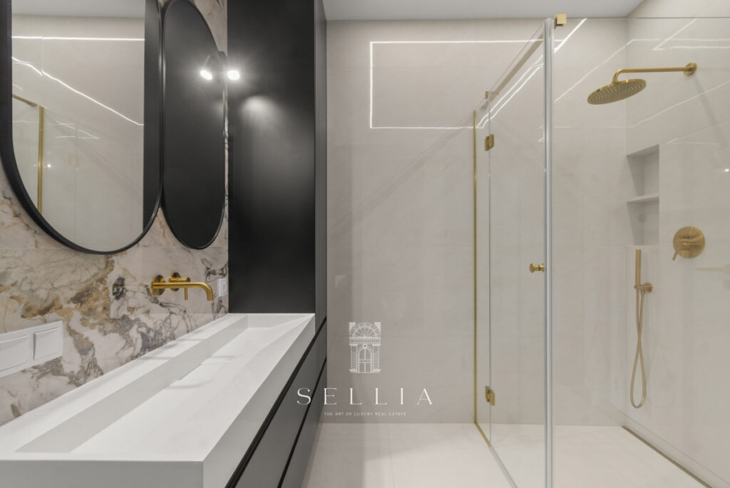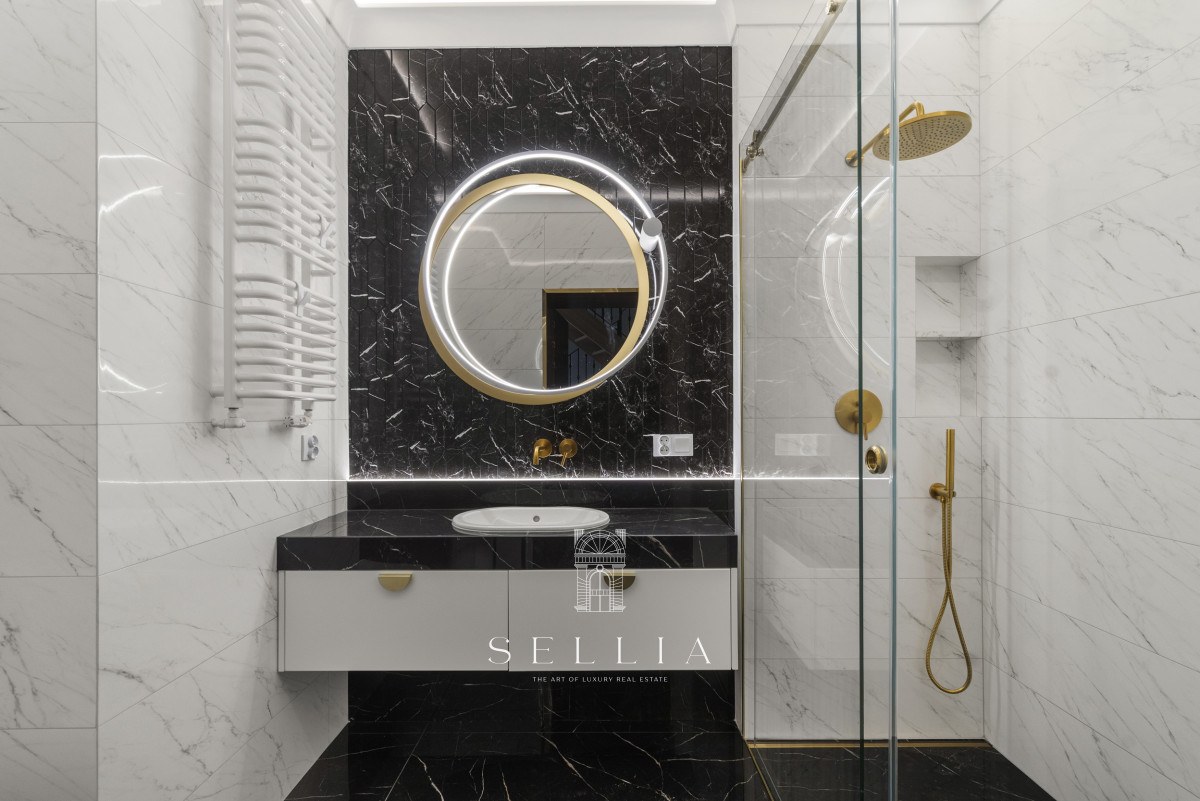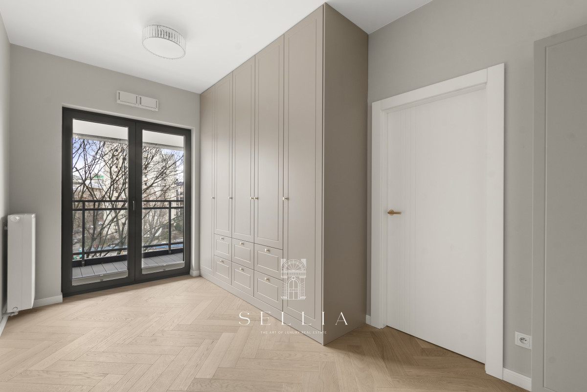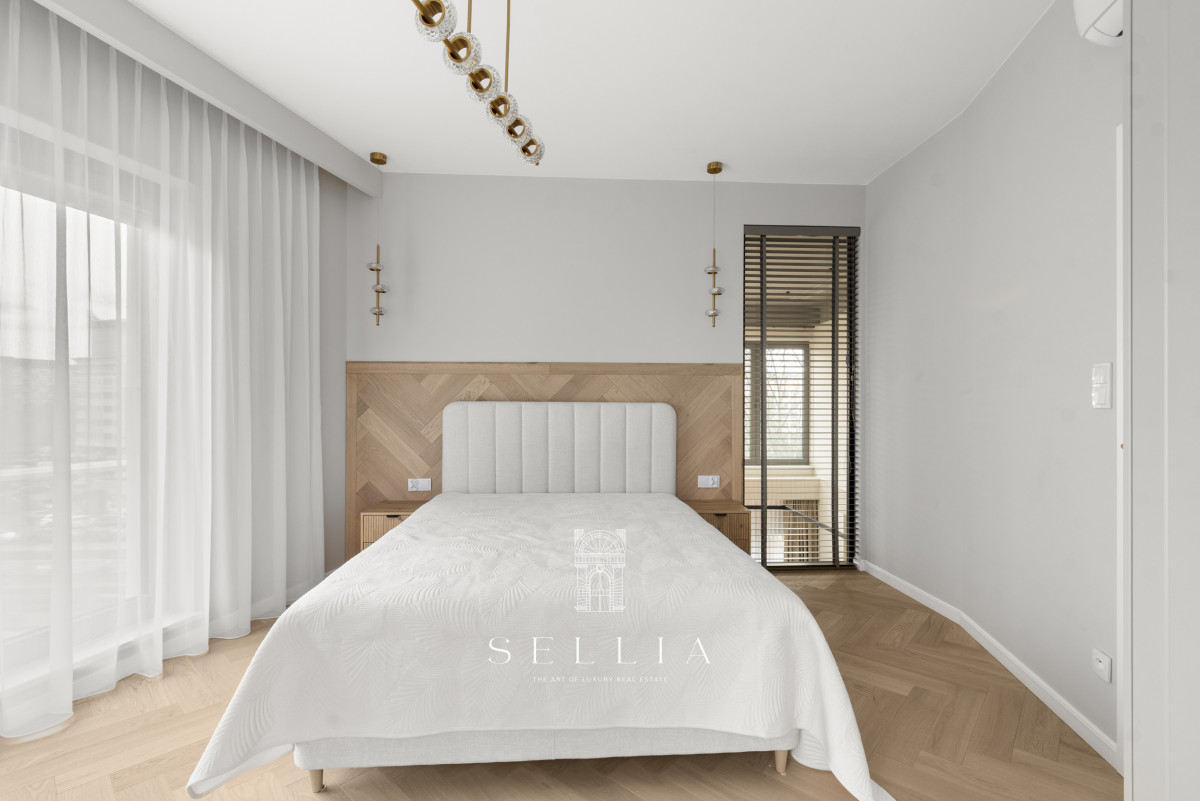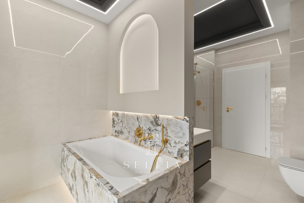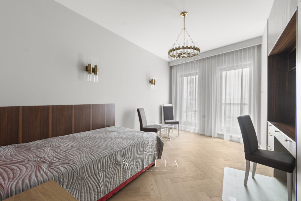 The apartment is new, finished to a high standard, with attention to detail and the quality of materials used. All rooms are air-conditioned. High ceilings, panoramic windows, and carefully selected finishes create an elegant, modern interior.