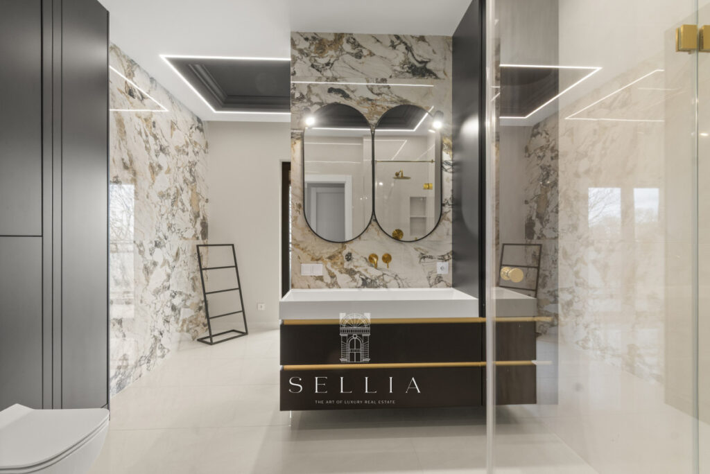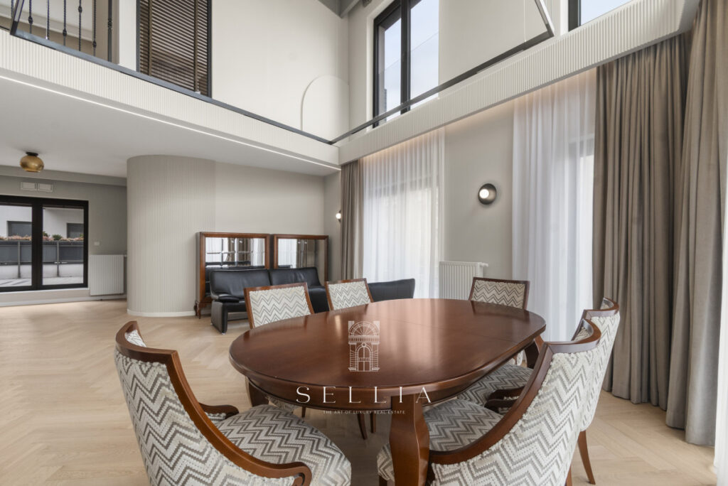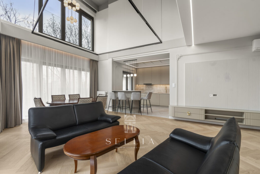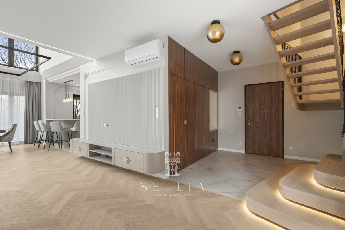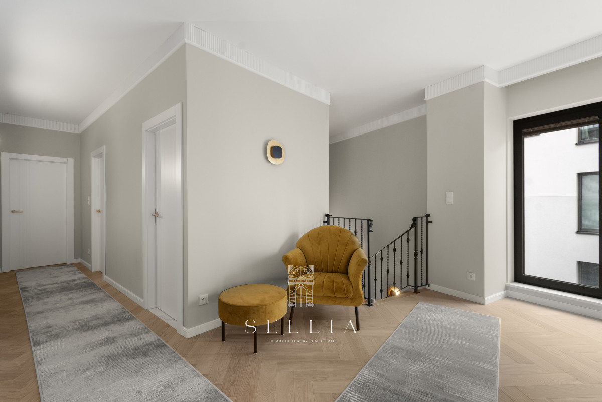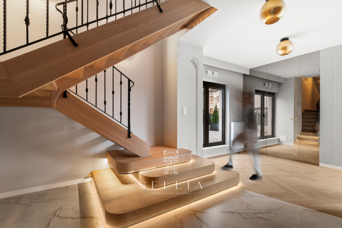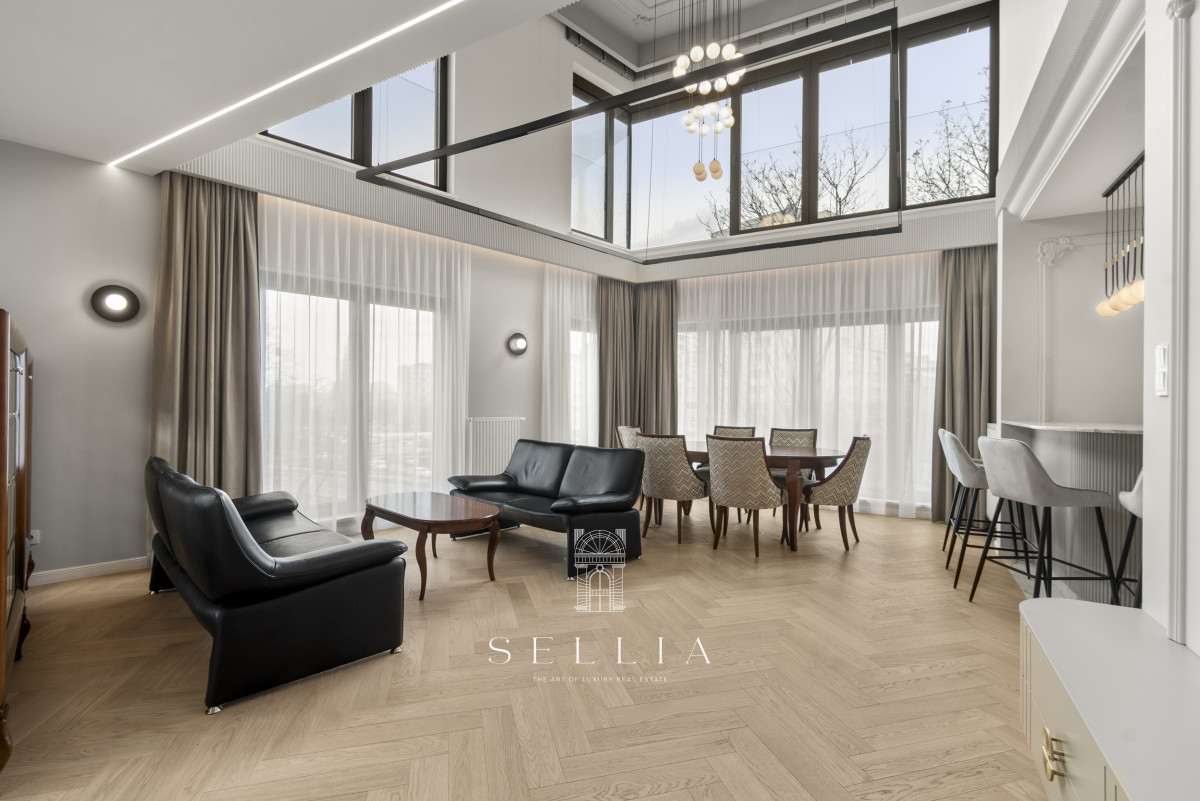 Brand-new, two-level apartment spanning 193 m², located in the heart of Warsaw, near Browary Warszawskie. The impressive ceiling height of nearly 6 meters in the living room, combined with large windows, creates a spectacular, light-filled living space.