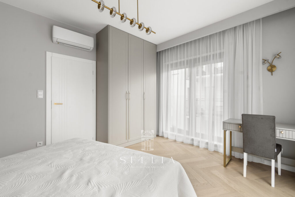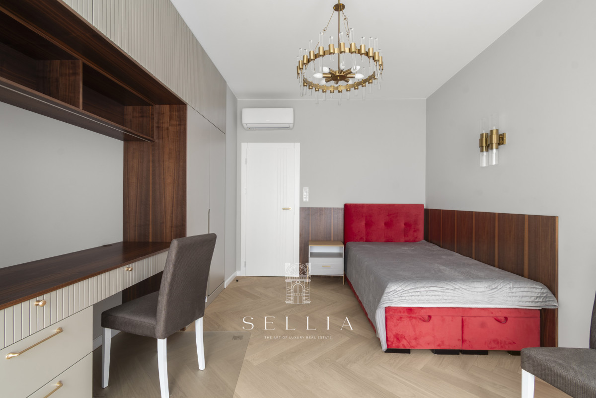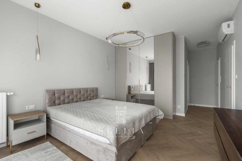 Apartament jest nowy, wykończony w wysokim standardzie, z dbałością o detale oraz jakość zastosowanych materiałów. Wszystkie pomieszczenia są klimatyzowane. Wysokie sufity, panoramiczne okna oraz starannie dobrane wykończenia tworzą eleganckie, nowoczesne wnętrze.