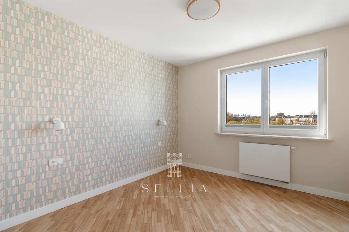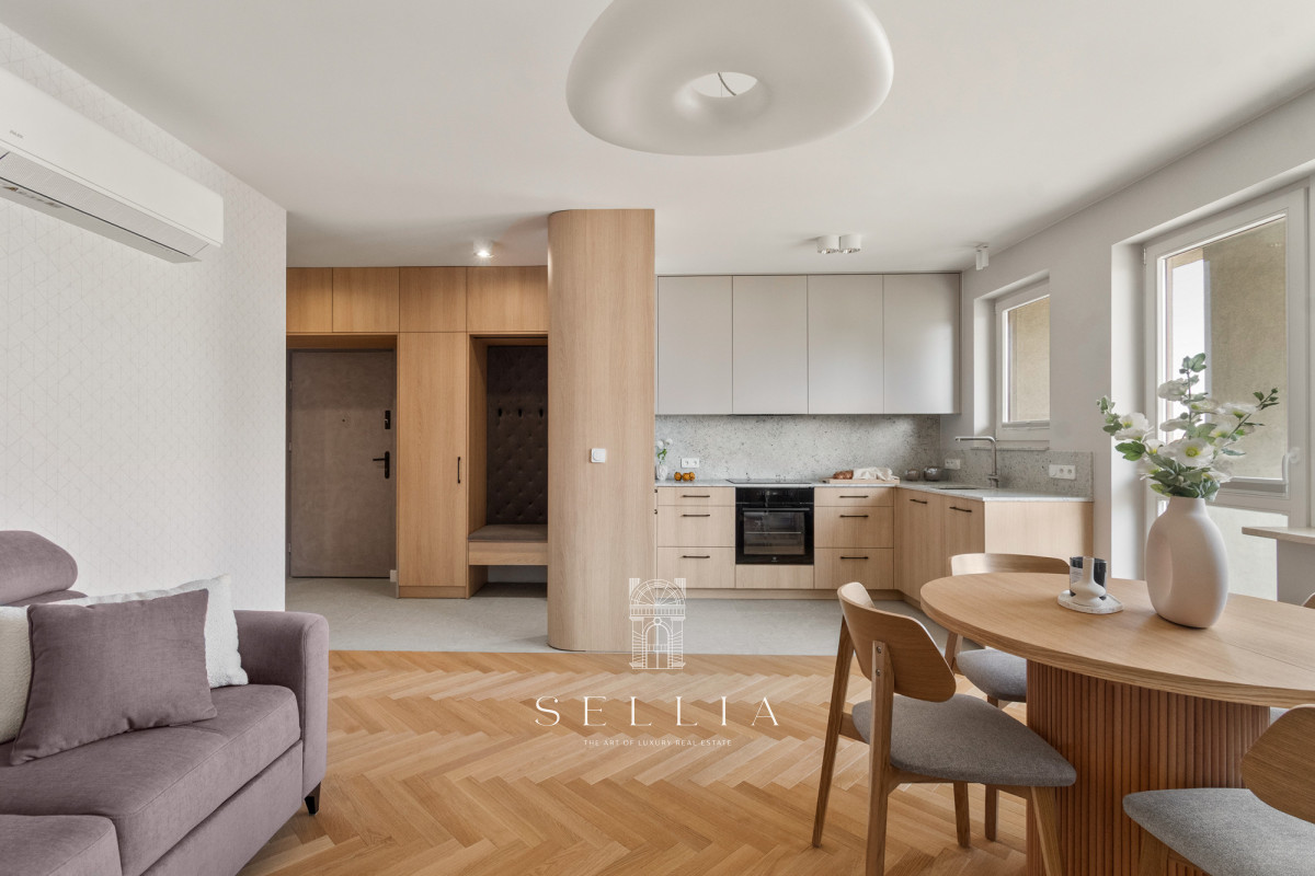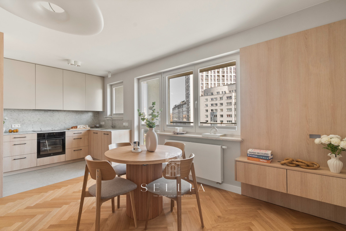 Wnętrze zostało wykończone w ciepłej, nowoczesnej palecie barw, z przewagą beżu i naturalnego drewna. Wysoki standard podkreśla drewniana stolarka okienna oraz nowa nawierzchnia balkonu. Położenie na ostatniej kondygnacji zapewnia nowym mieszkańcom ciszę oraz wyjątkowe poczucie prywatności.