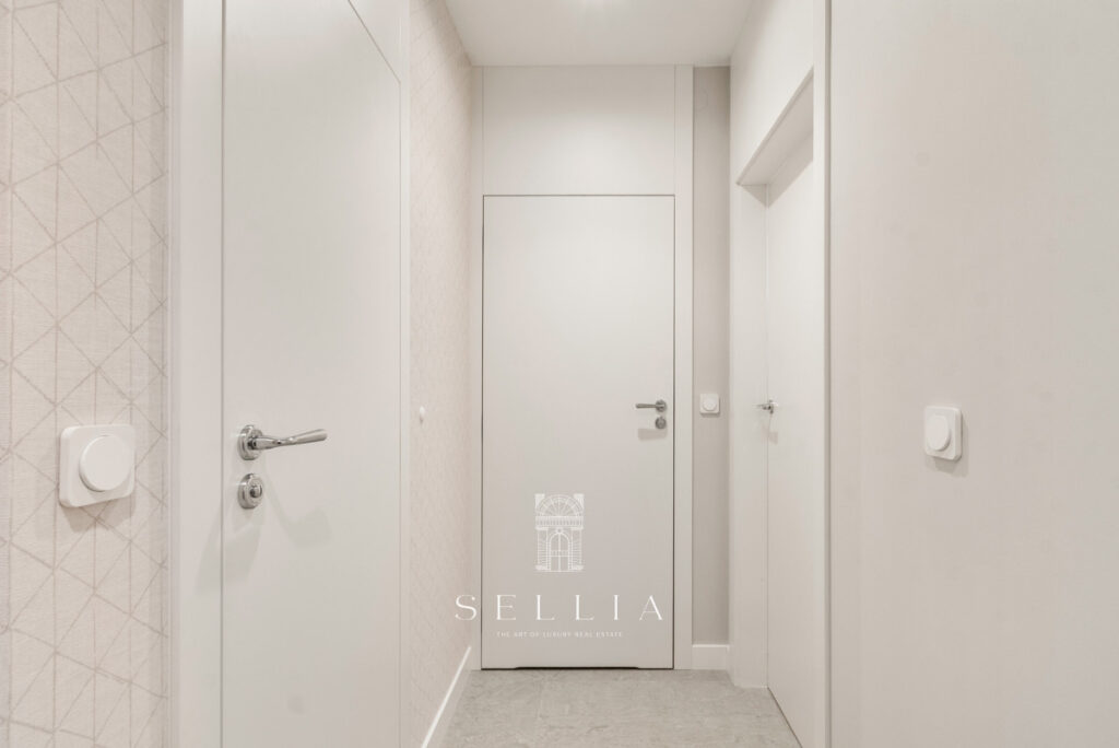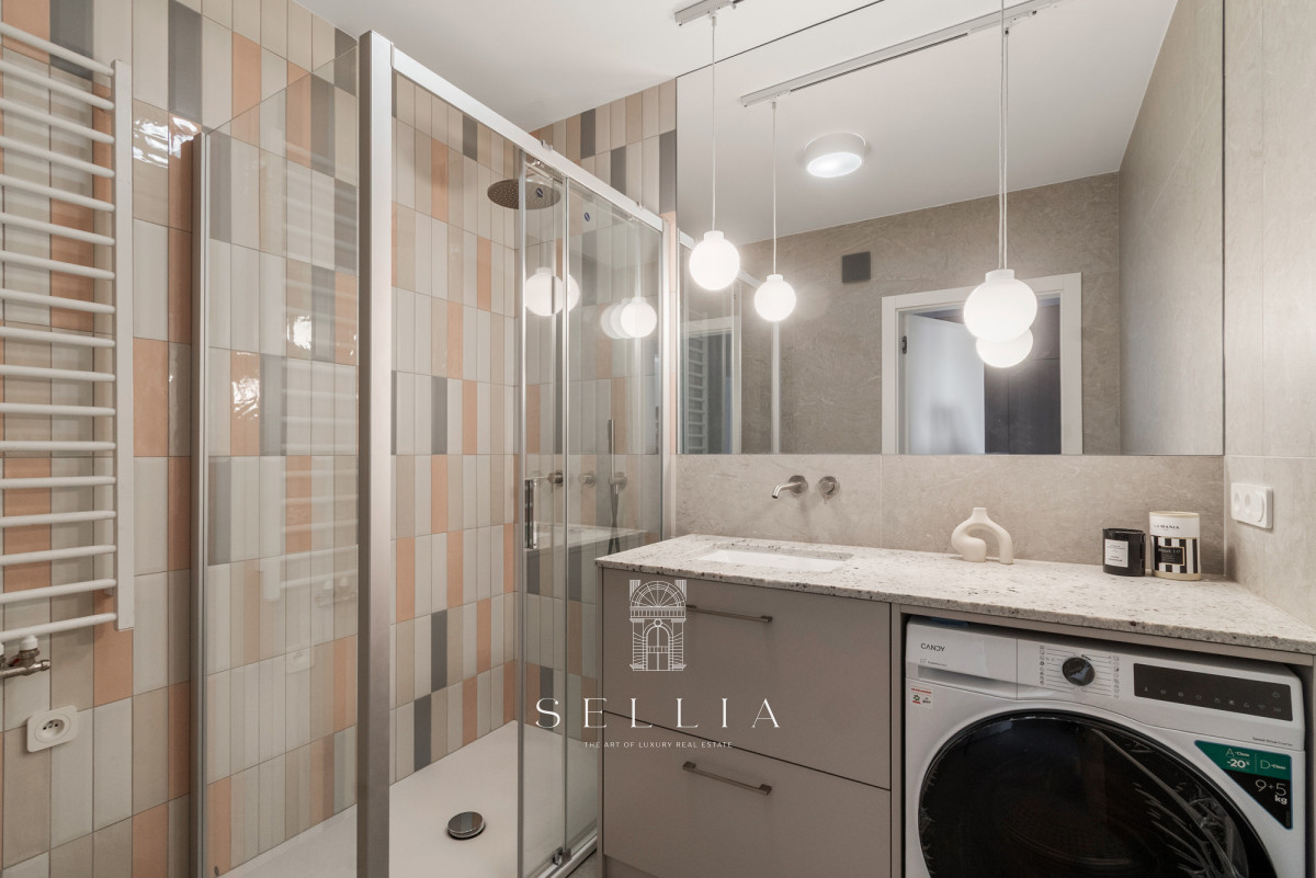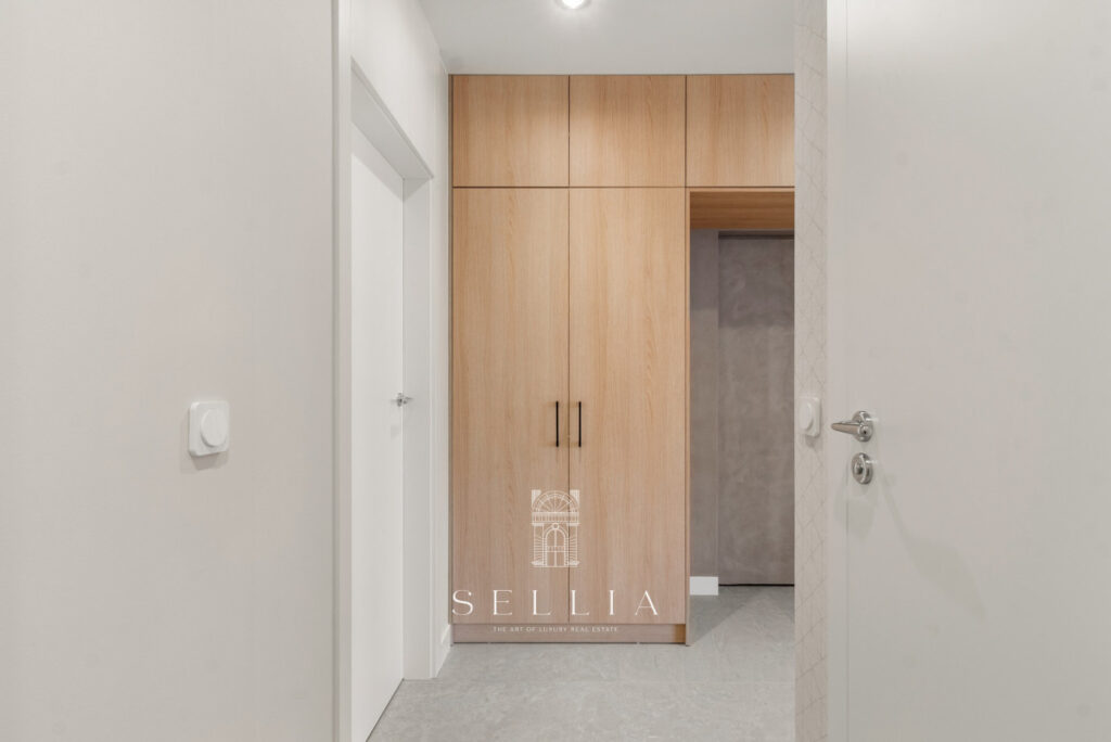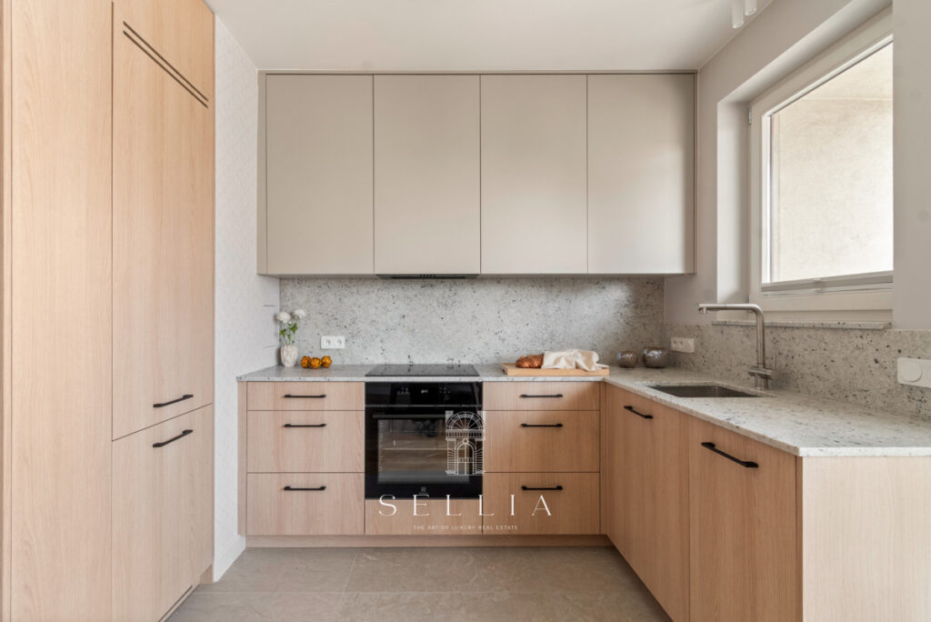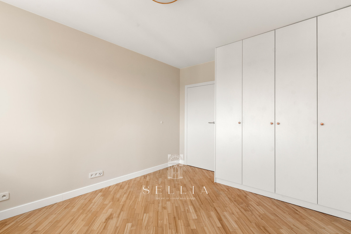 The interior has been finished in a warm, modern color palette, with a predominance of beige and natural wood. The high standard is emphasized by the wooden window frames and the new balcony flooring. The top-floor location provides new residents with a quiet and exceptional sense of privacy.