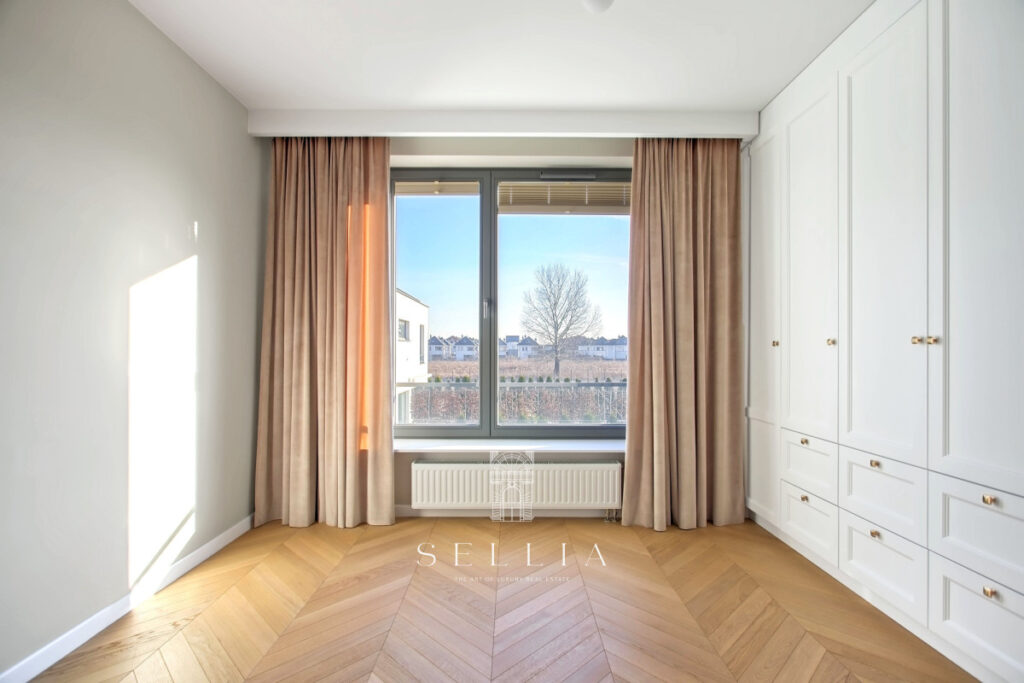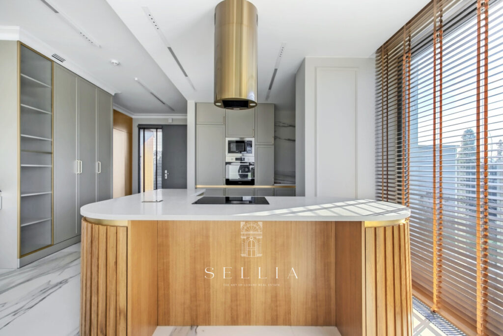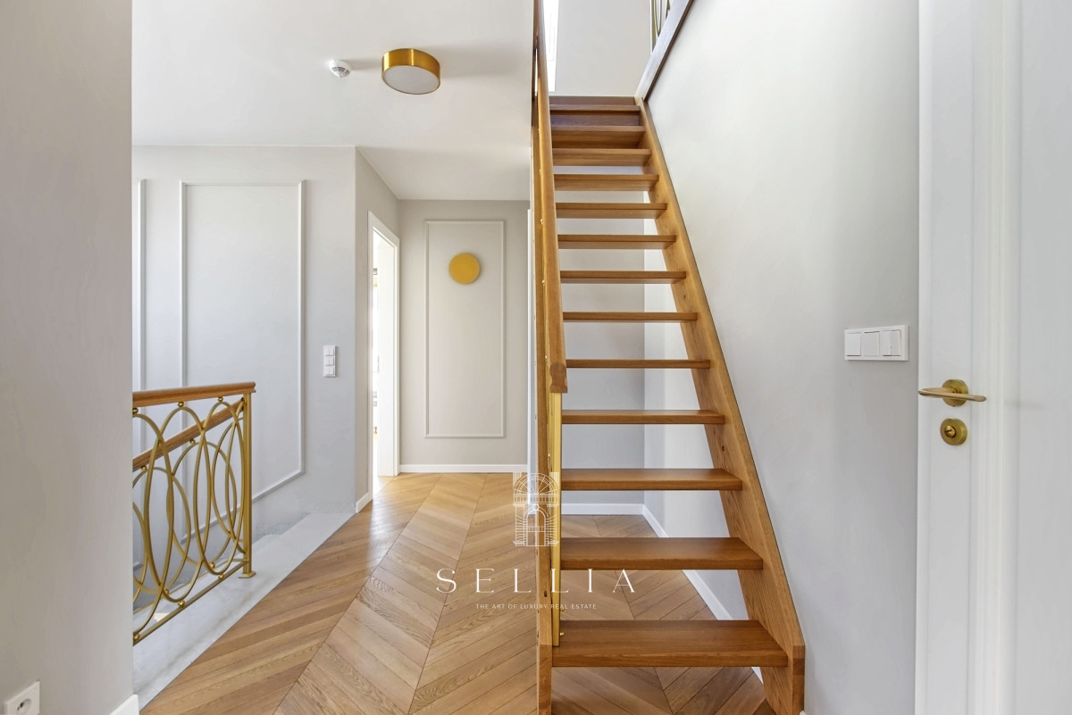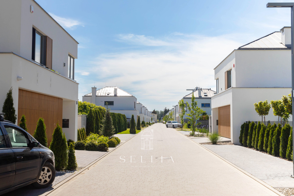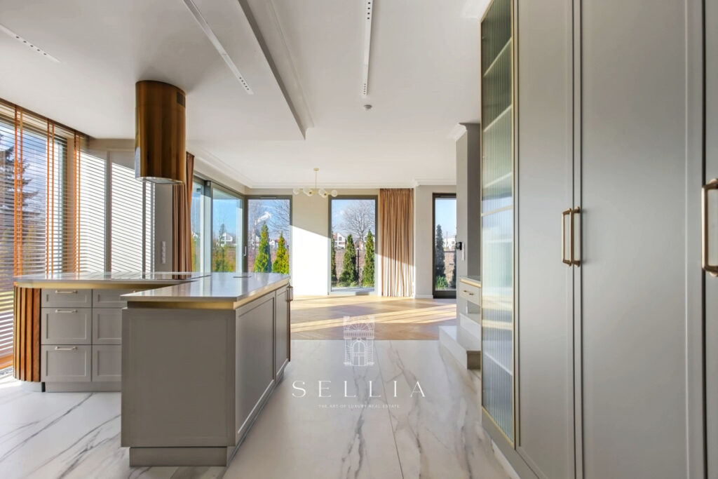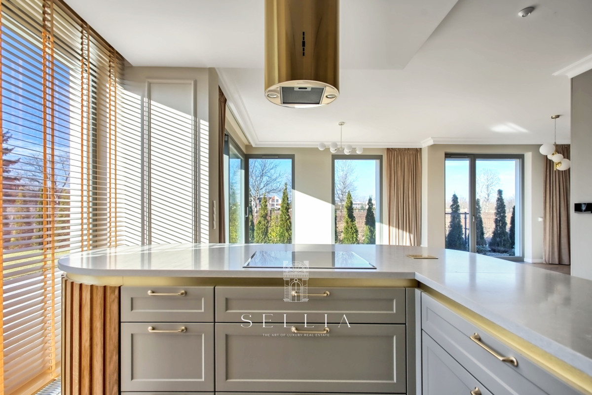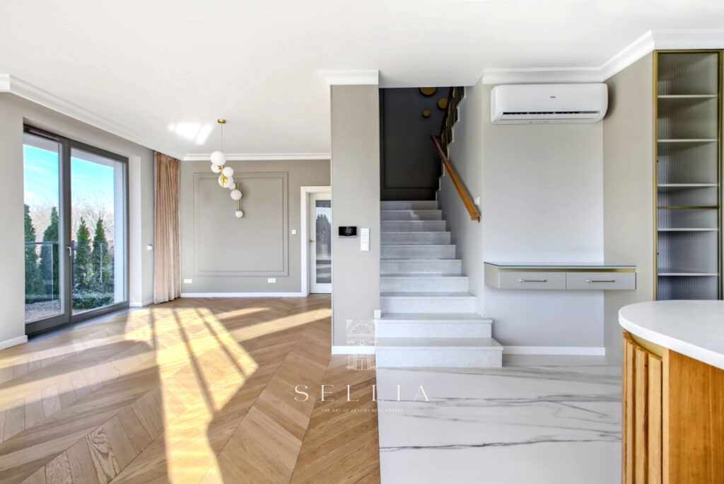 The property has been designed with the most demanding residents in mind, combining aesthetics with modern technology. The house is air-conditioned, ensuring comfort at any time of the year. The interiors are finished to a very high standard – quartz sintered stone dominates the floors and countertops, and the living room features elegant French herringbone parquet.