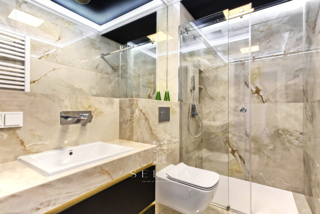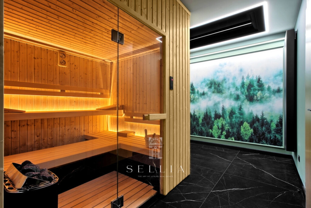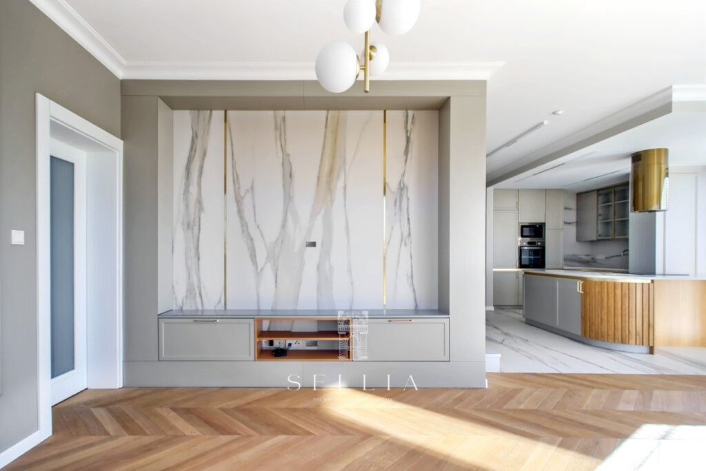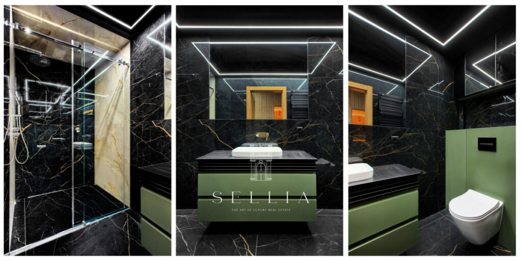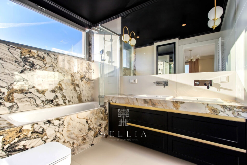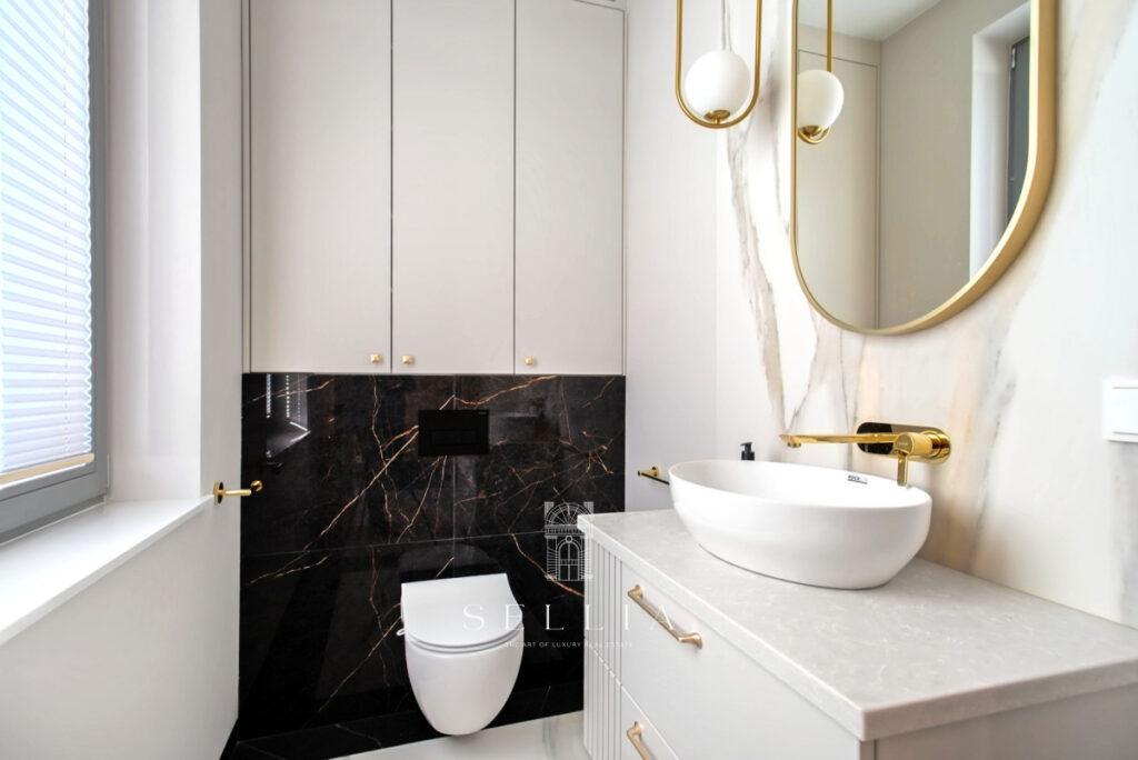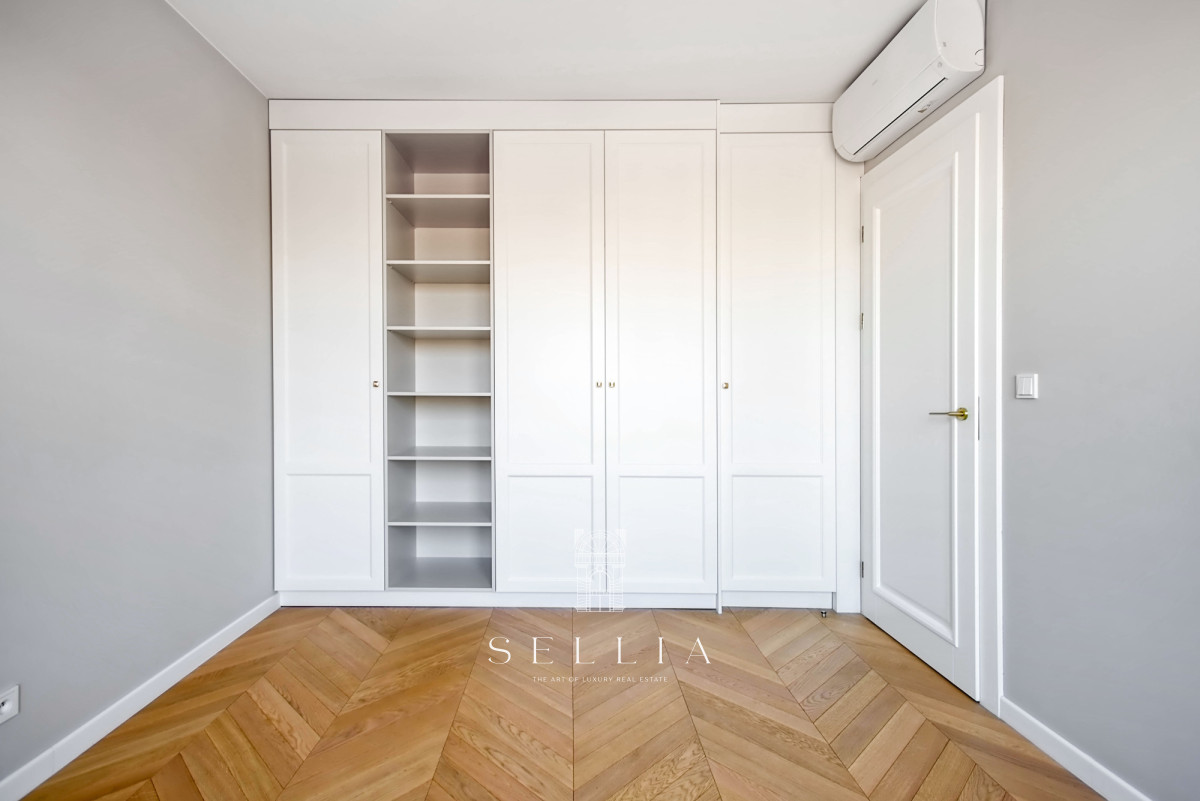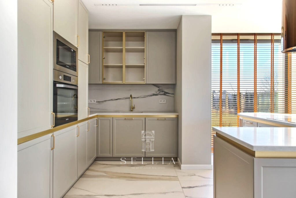 The property has been designed with the most demanding residents in mind, combining aesthetics with modern technology. The house is air-conditioned, ensuring comfort at any time of the year. The interiors are finished to a very high standard – quartz sintered stone dominates the floors and countertops, and the living room features elegant French herringbone parquet.