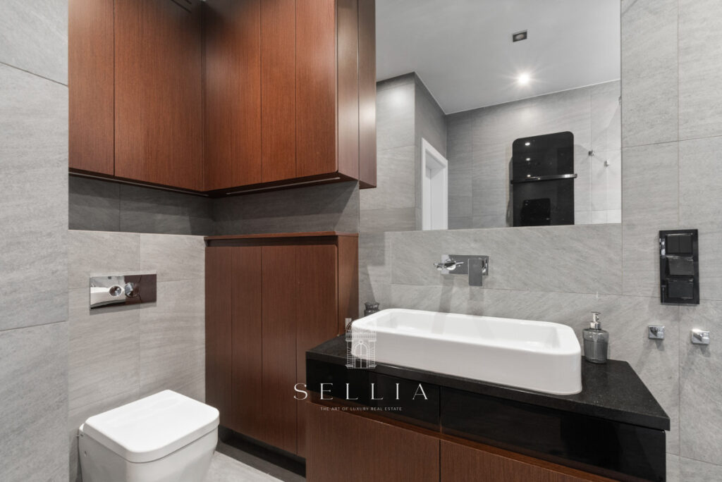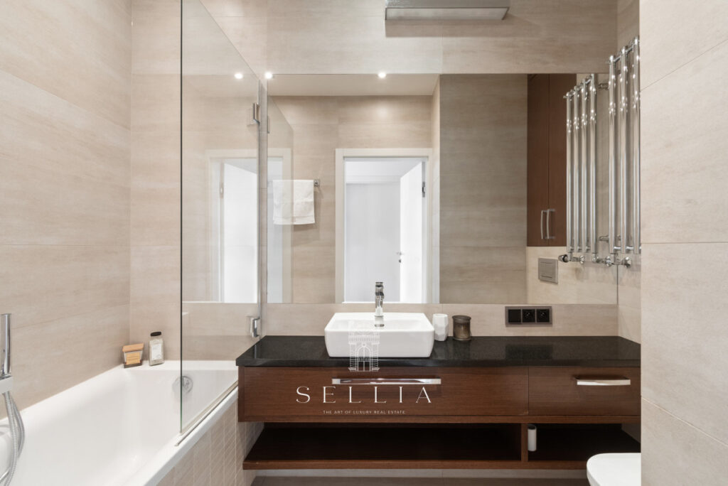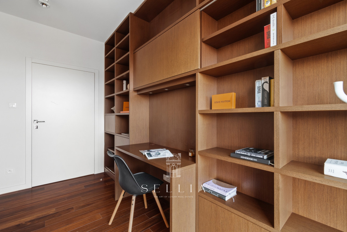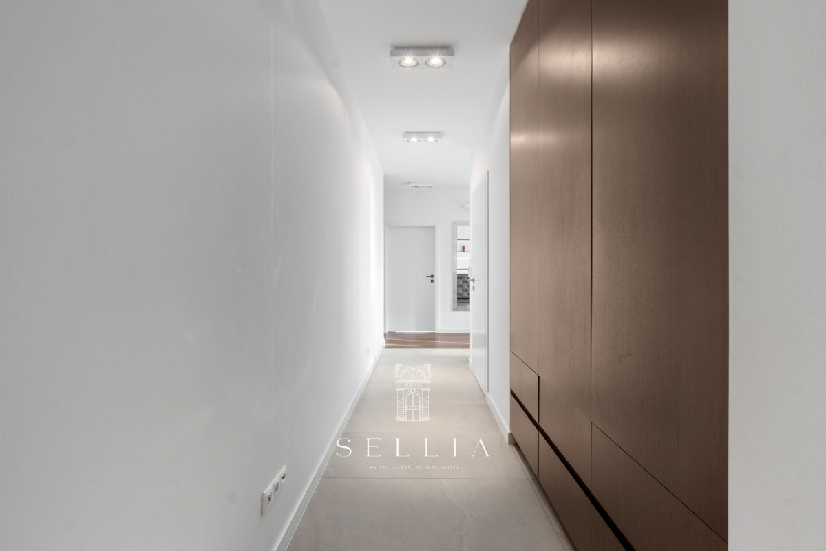 Air conditioning in the living room ensures comfort, especially during the summer months. Built-in wardrobes in the hallway offer both practical and aesthetic storage space. The coherent and elegant interior design harmonizes with the prestigious character of the building. Furnishings can be arranged according to the future owner’s preferences.