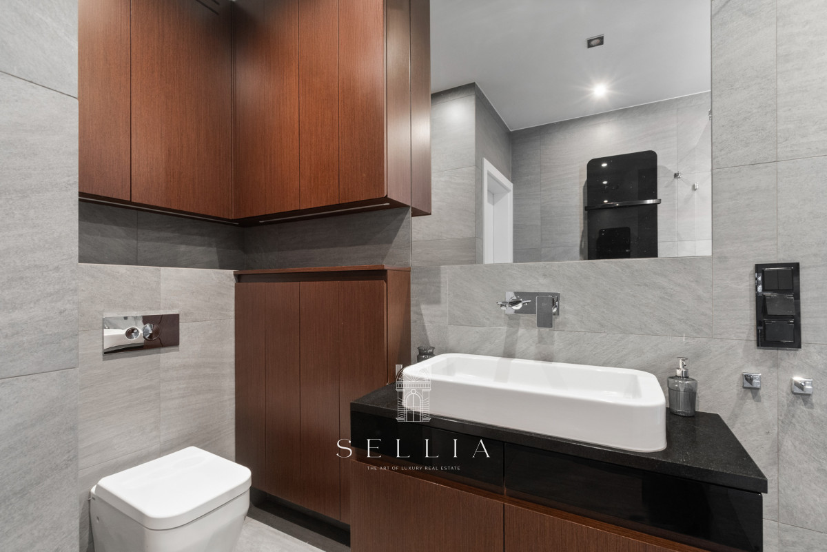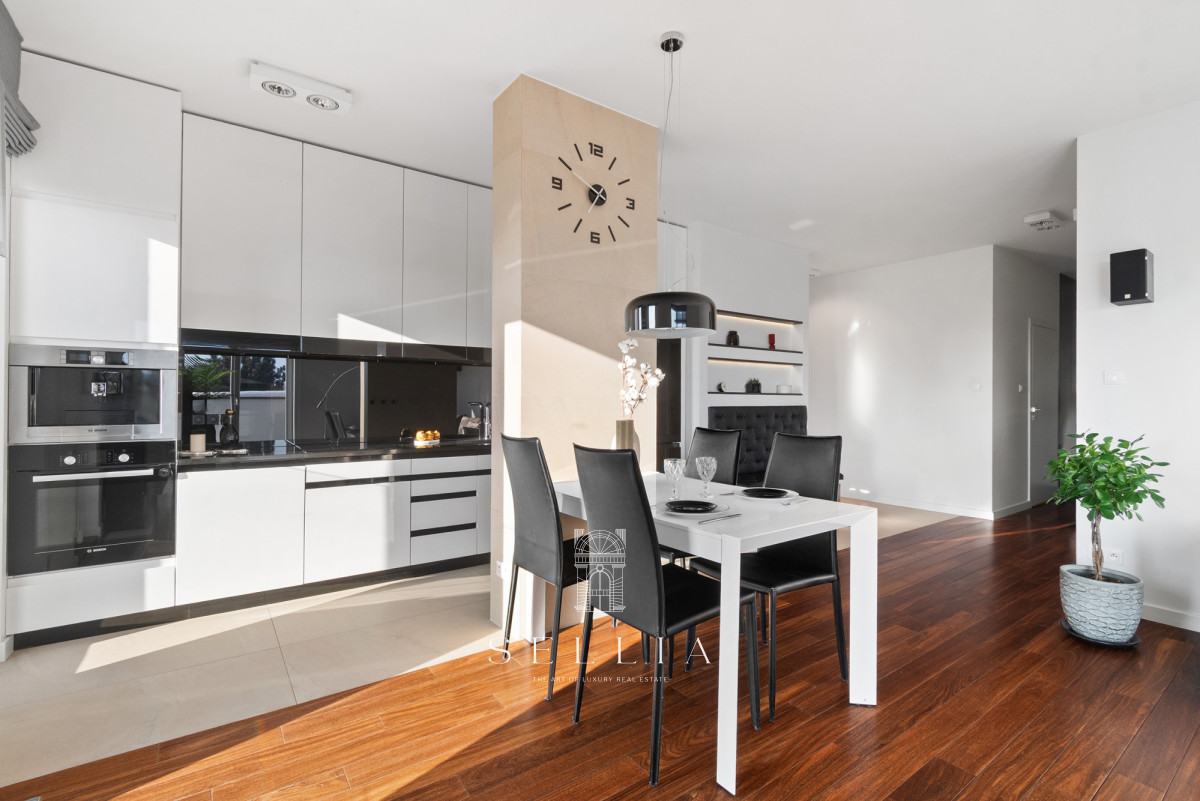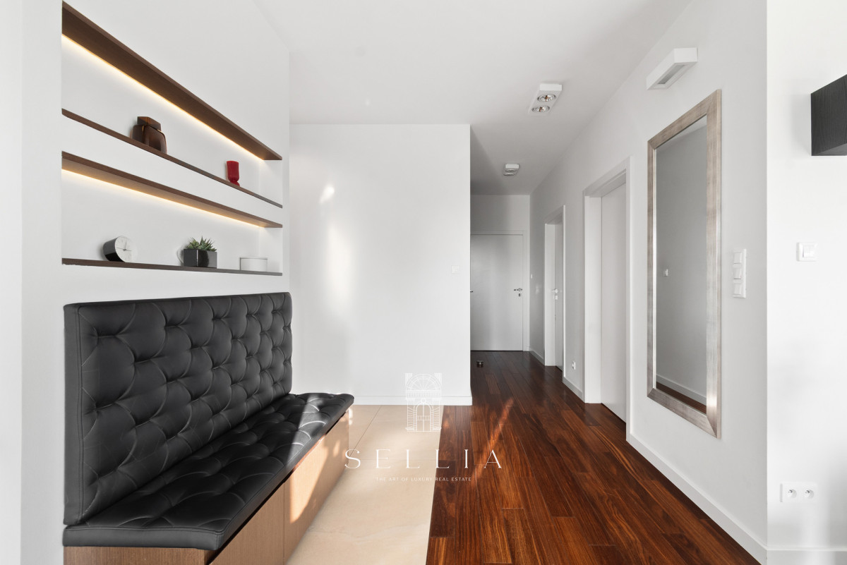 Klimatyzacja w salonie zapewnia komfort użytkowania, szczególnie w sezonie letnim. Zabudowane szafy w hallu oferują estetyczną i praktyczną przestrzeń do przechowywania. Spójna, elegancka aranżacja wnętrza harmonijnie współgra z reprezentacyjnym charakterem budynku. Umeblowanie pozostaje do indywidualnych ustaleń z przyszłym właścicielem.
