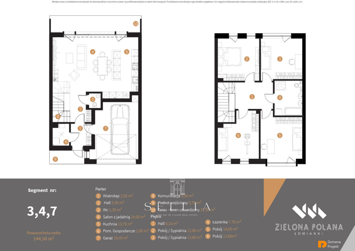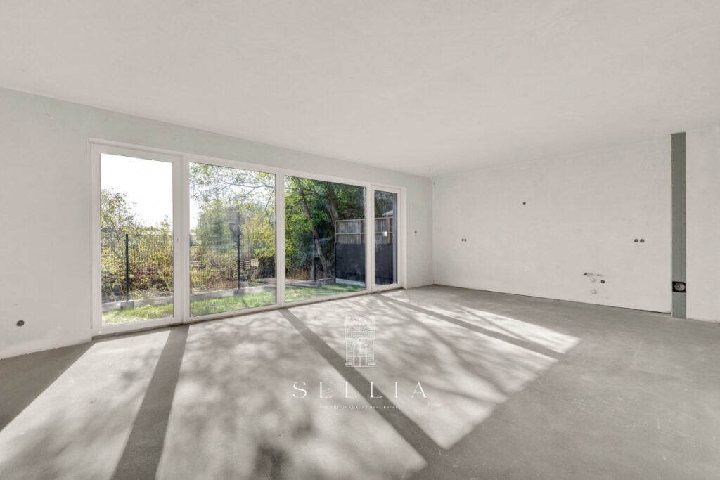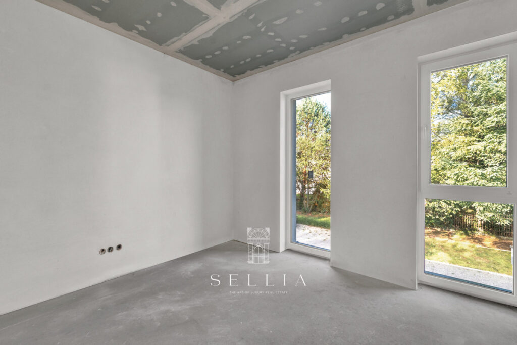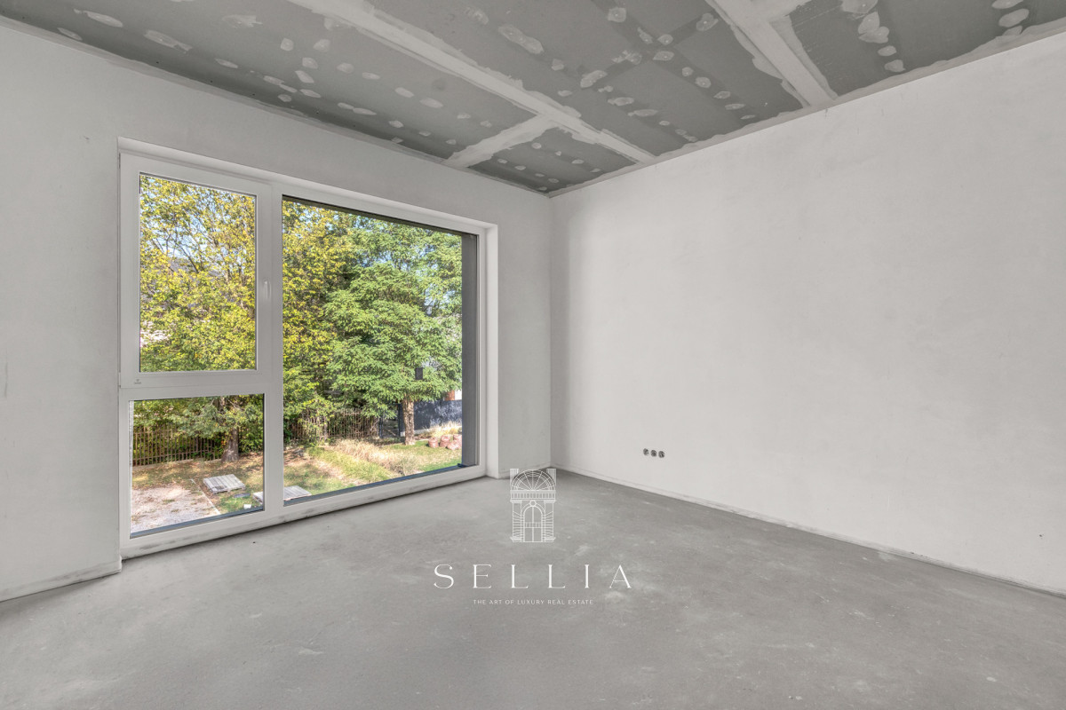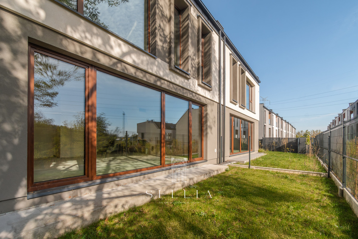 ZIELONA POLANA is a small, private estate in Central Łomianki on Łąkowa Street, consisting of eight terraced houses designed by DOMENA PROJEKT. The house is built using traditional masonry technology (Porotherm), with an integrated garage and a usable attic, designed for the comfort for a family of four or five. Large windows provide excellent natural light, and the functional layout allows for individual customization. The estate is fenced, connected to municipal utilities, and offers private gardens and modern architecture that ensures comfort and privacy.