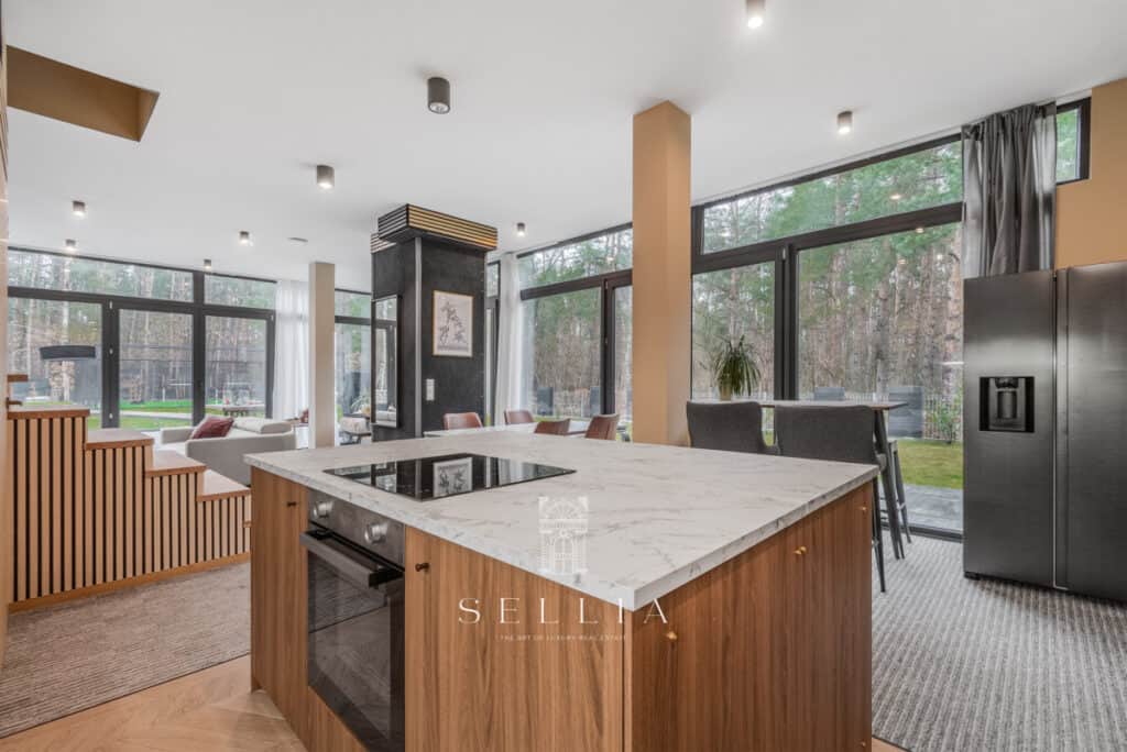 Wnętrze zostało doskonale zaprojektowane i wypełnione naturalnym światłem dzięki wysokim przeszkleniom, tworząc przestrzeń pełną harmonii i komfortu.