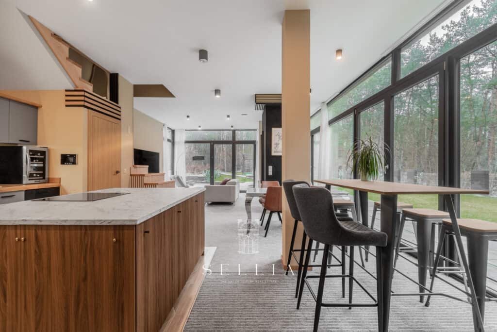 Wnętrze zostało doskonale zaprojektowane i wypełnione naturalnym światłem dzięki wysokim przeszkleniom, tworząc przestrzeń pełną harmonii i komfortu.