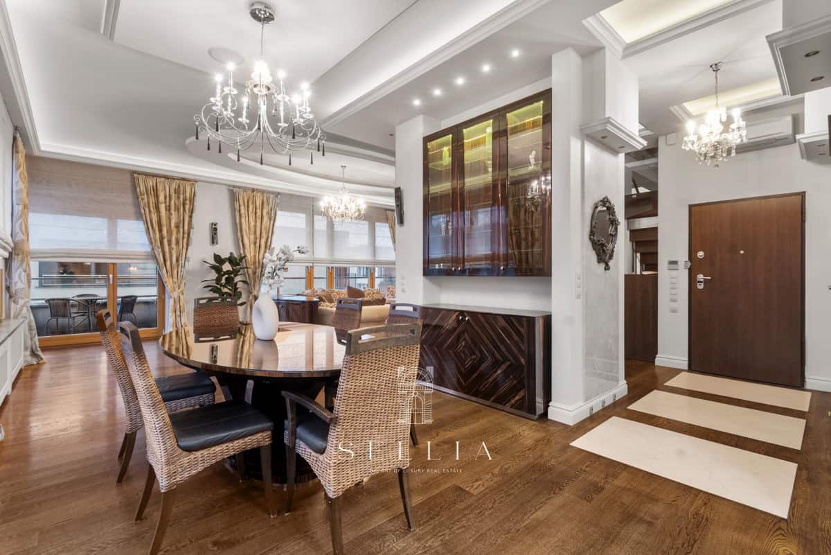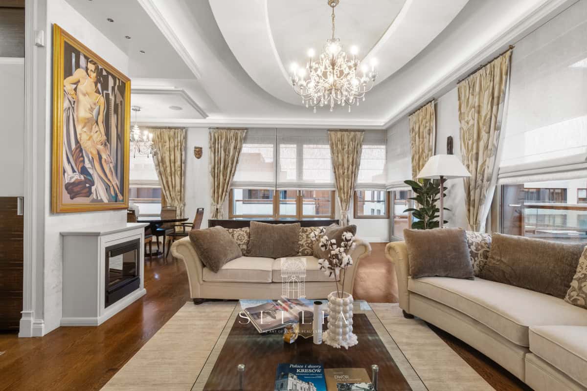 Mieszkanie wykończone w bardzo wysokim standardzie, w pełni umeblowane i wyposażone we wszystkie niezbędne sprzęty. Cała przestrzeń została zaprojektowana z dbałością o detale, oferując staranne i eleganckie wykończenie, które podkreśla charakter apartamentu. Wyjątkowym akcentem jest duże, zabudowane akwarium, stanowiące efektowny element wystroju i nadające wnętrzu niepowtarzalny klimat. Dwa balkony oraz prywatny taras na dachu zapewniają idealne warunki do codziennego relaksu i spędzania czasu na świeżym powietrzu.